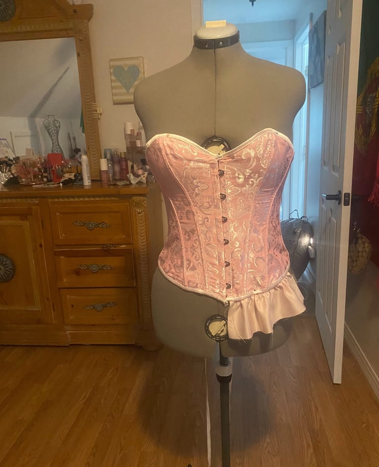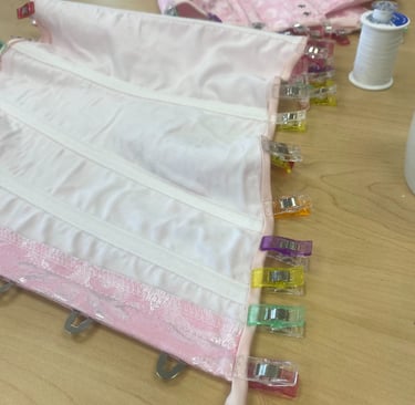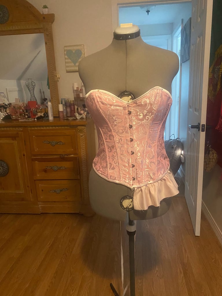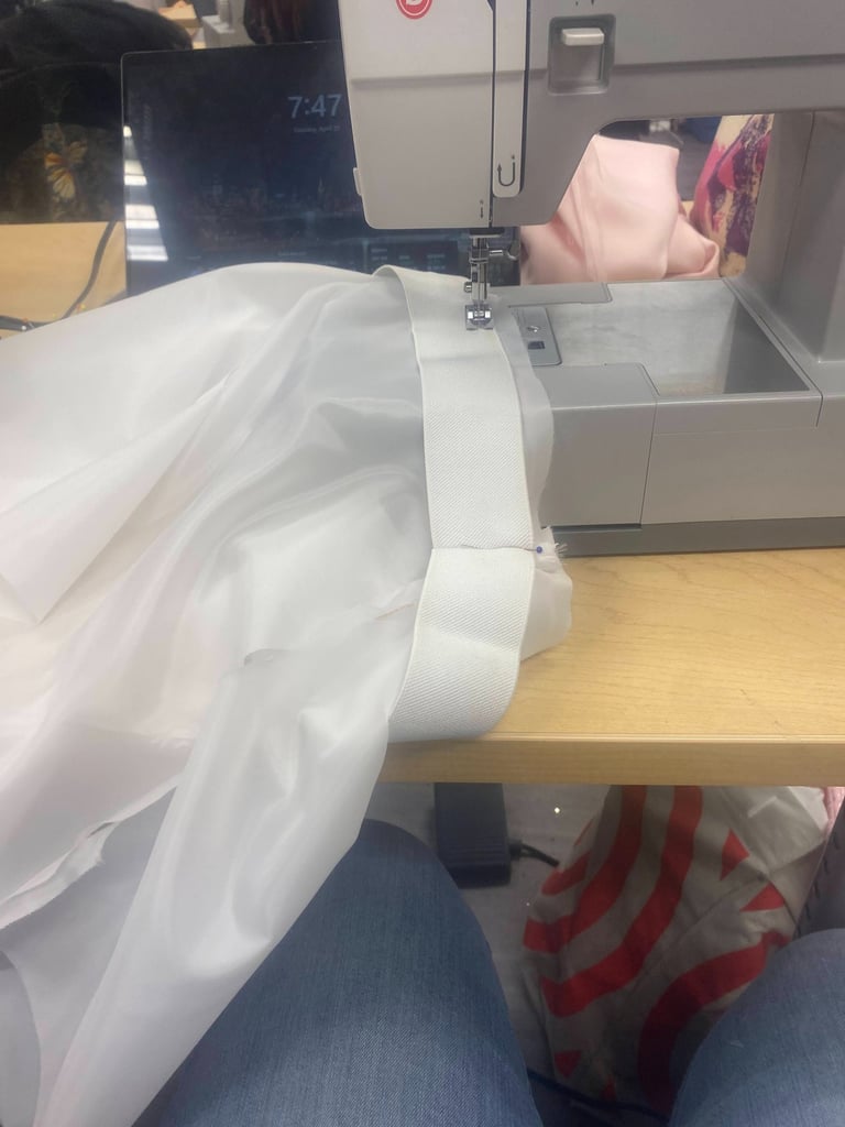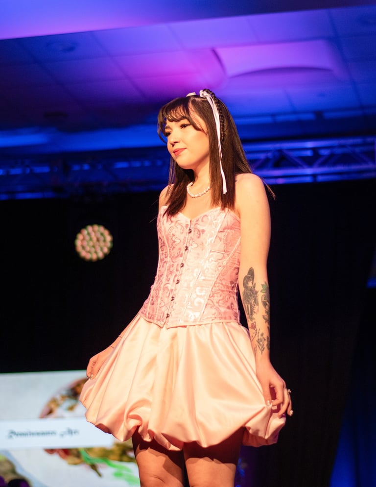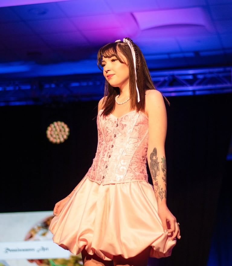 Inspired by Marie Antonitte and all of her feminine and lavished outfits during the rococo era of art. I wanted to create something very girly, light and princess-y with the fitted corset and a puffer skirt all in a light pink shade. The corset was dyed and the edge was changed to match the fabric of the skirt. The puffer skirt is gathered with an elastic attached to the lining.